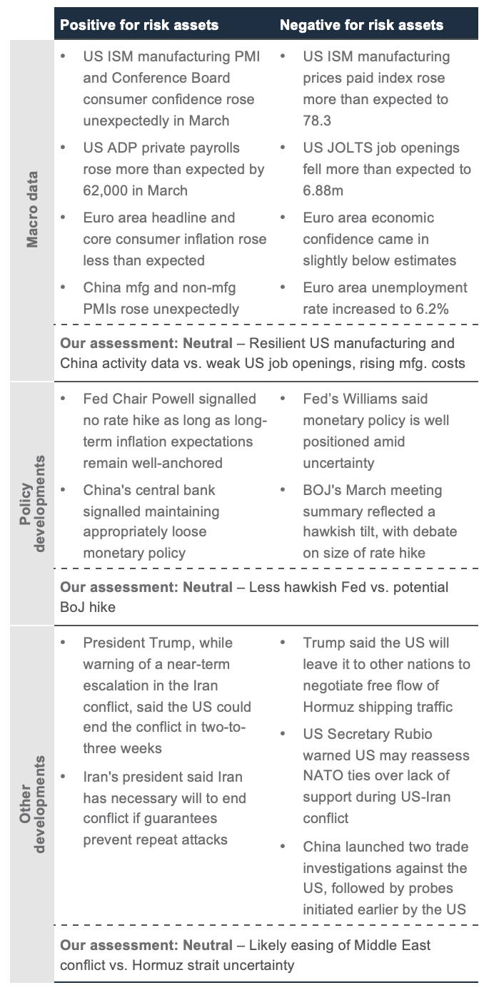 Our weekly net assessment: On balance, we see the past week’s data and policy as neutral for risk assets in the near-term