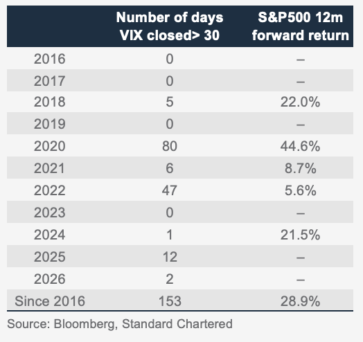 Our view: The VIX closing above 30 signals market stress, but such episodes have historically been short-lived, preceding strong recoveries – with S&P500 forward 12-month returns averaging 29%, far above the 14% long-term average.