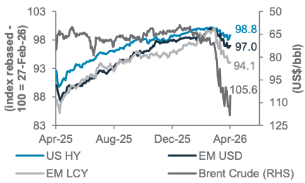 EM USD & local currency (LCY) government bonds, US HY bonds have fallen since the onset of the Middle east conflict
