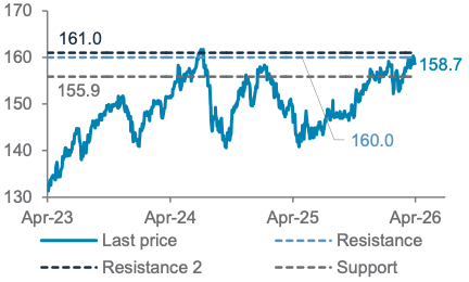 Technically, USD/JPY is forming a significant resistance zone at 160-161. We see the pair facing downside risk, with support at 155.9 (200-day moving average) in the coming week.