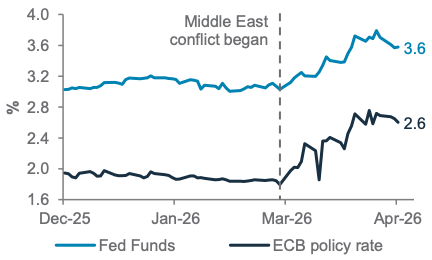 Markets have repriced policy rate expectations higher in the US and the Euro area since the Middle East conflict began