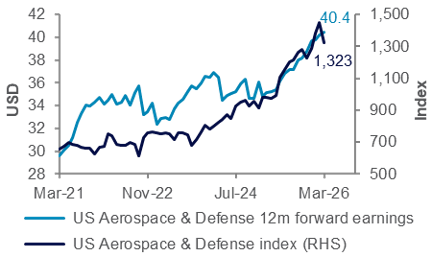 That said, we retain a positive view on the sector. Our base case remains for the conflict to de‑escalate in a few weeks, supporting a recovery in commercial aerospace activity and easing oil prices. In addition, geopolitical developments since 2026 suggest a potential ramp‑up in US diplomatic engagement ahead of the midterm elections and renewed focus on defence priorities. President Trump announced military spending of USD 1.5trn for 2027, a 50% increase from this year’s budget. 12‑month forward earnings growth of over 40% also provides a strong tailwind for a sustained sector recovery.