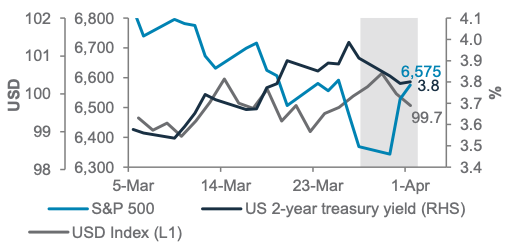 S&P500 index (up), US 2y yield (down), USD index (down)