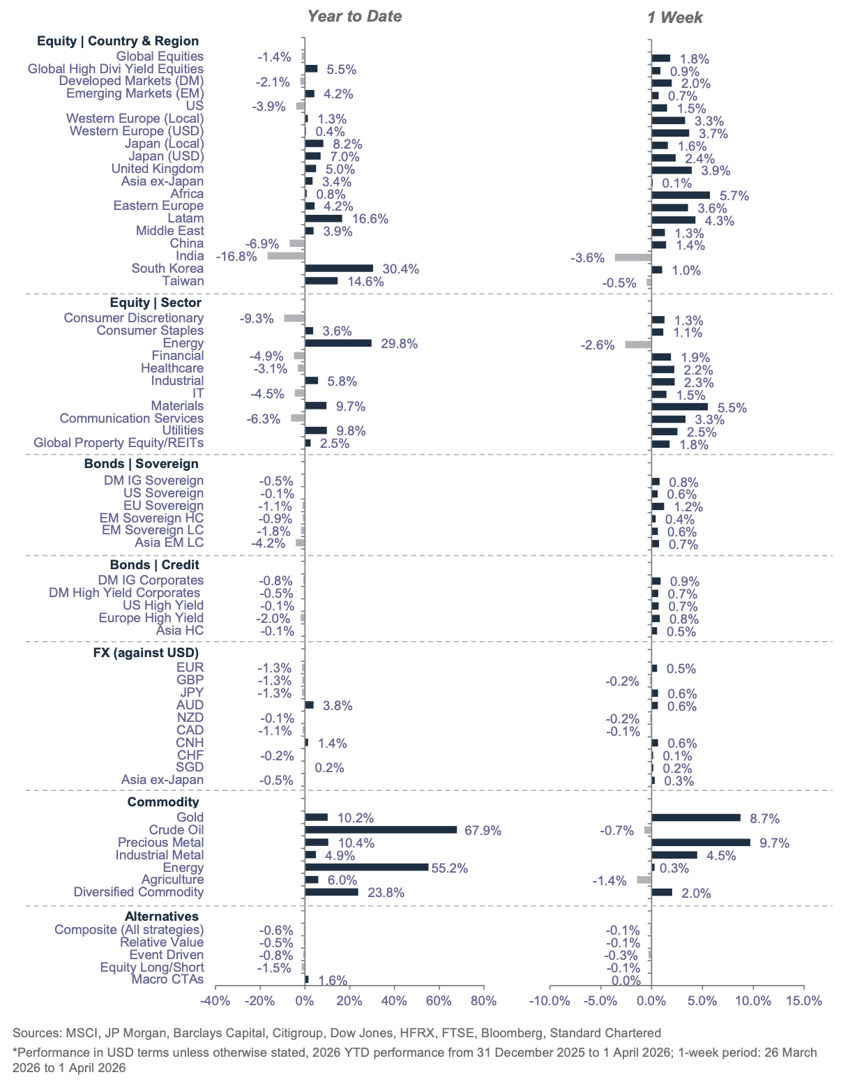 Chance to lock in elevated bond yields: There are early signals policymakers and bond markets are starting to focus more on the conflict’s impact on economic growth than on inflation. Fed Chair Powell stated this week that the central bank can look past a temporary spike in oil prices as long as inflation expectations are steady. This led to a retreat in the US 2-year government bond yield, which reacts to rate changes. The renewed emphasis on supporting growth strengthens our base case that the Fed will eventually cut rates in H2 to revive the job market. Locking in the currently elevated yields on high-quality bonds offers a favourable risk-reward trade-off.