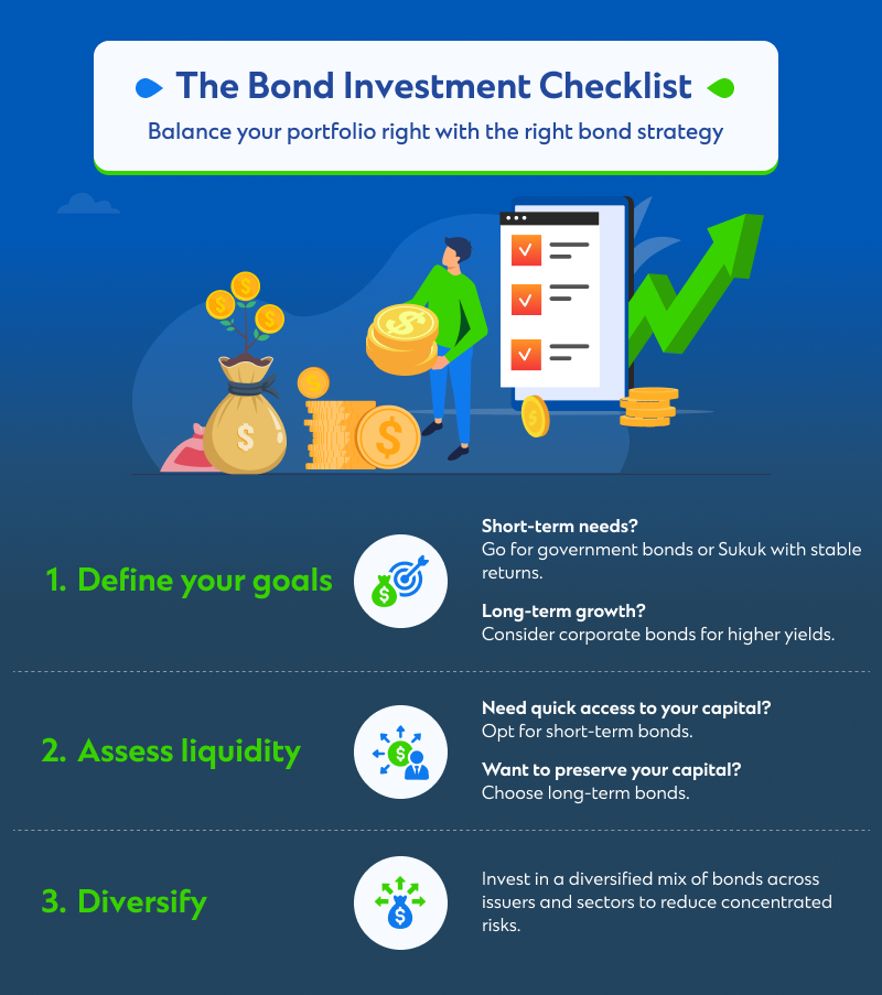 Depending on whether you're looking to fulfill long- or short-term financial goals, you can choose bonds that offer capital appreciation (corporate bonds) or bonds that offer stable, albeit lower returns (government bonds and sukuk).