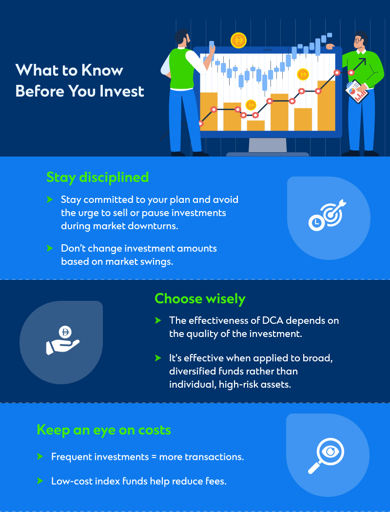 - While DCA is a disciplined approach, it may yield lower returns than lump-sum investing in a consistently rising market.