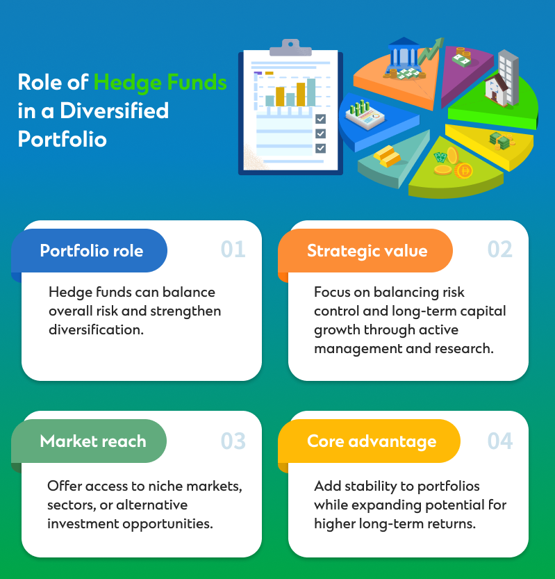 - Hedge funds are privately managed alternative investment vehicles that pool capital from qualifying investors and typically aim to deliver strong returns regardless of broader market performance.