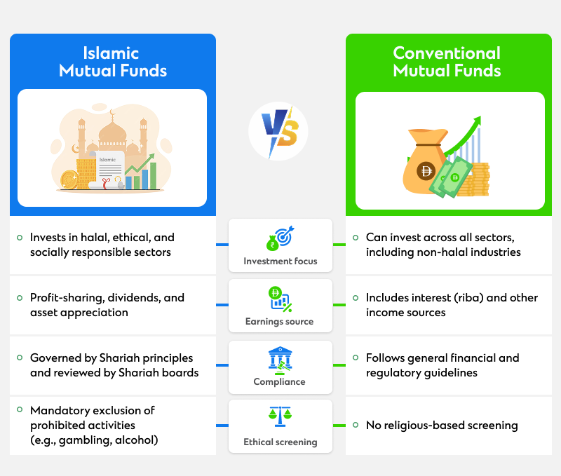 Investors looking for halal investment options can achieve their financial goals by investing in Shariah-compliant mutual funds. Unlike conventional mutual funds, Islamic mutual funds avoid investments in industries engaged in interest-based transactions, as Muslims are prohibited from earning interest (riba). Instead, the potential interest income is usually donated to charity.
