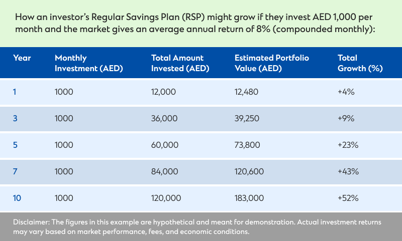 - Regular Savings Plans (RSPs) enable UAE residents to build long-term wealth systematically through consistent contributions and Dollar-Cost Averaging (DCA).
