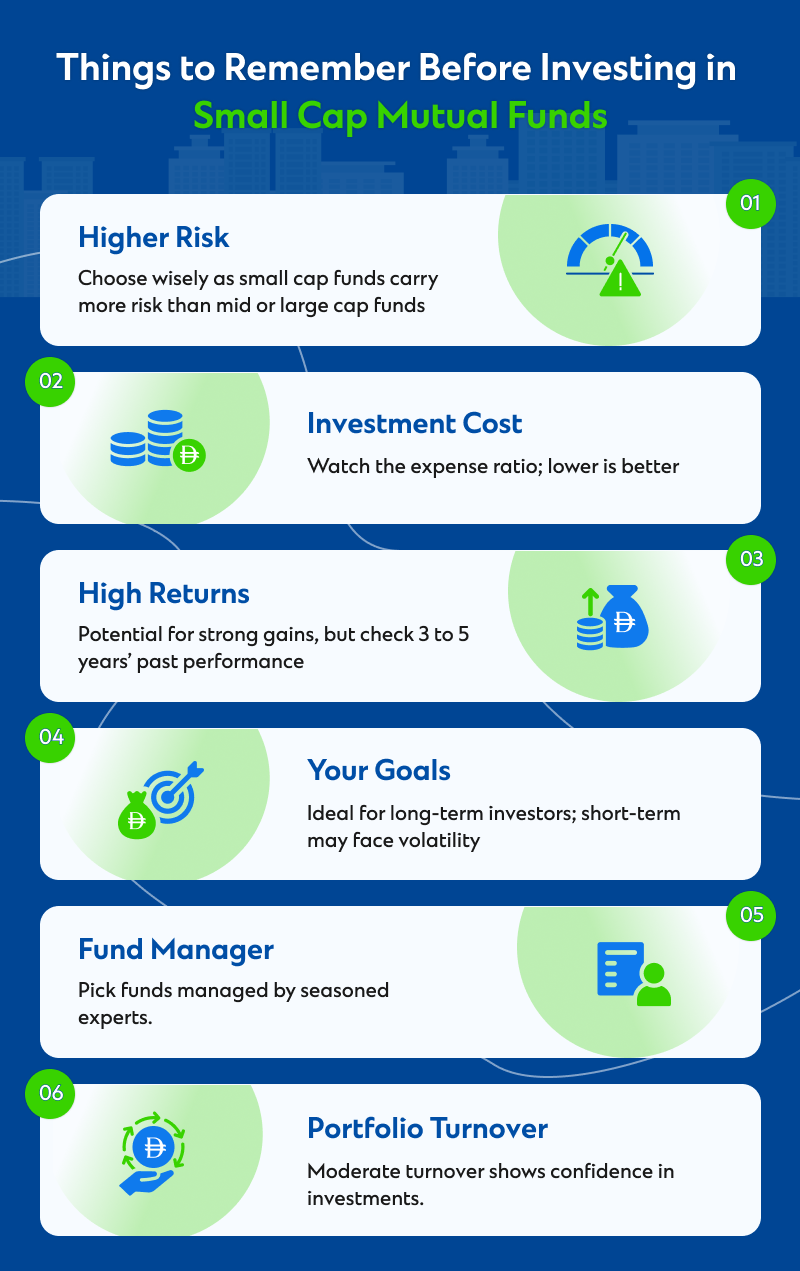 Investing in small-cap mutual funds may help investors optimise their potential returns and leverage long-term wealth creation. However, before investing, it is important to be clear about one’s financial objectives and risk tolerance. It is also crucial to acknowledge the high risk of small-cap fund investments. Portfolio diversification can also be achieved by including relatively stable asset classes such as large-cap funds, actively managed hybrid funds, or debt funds.