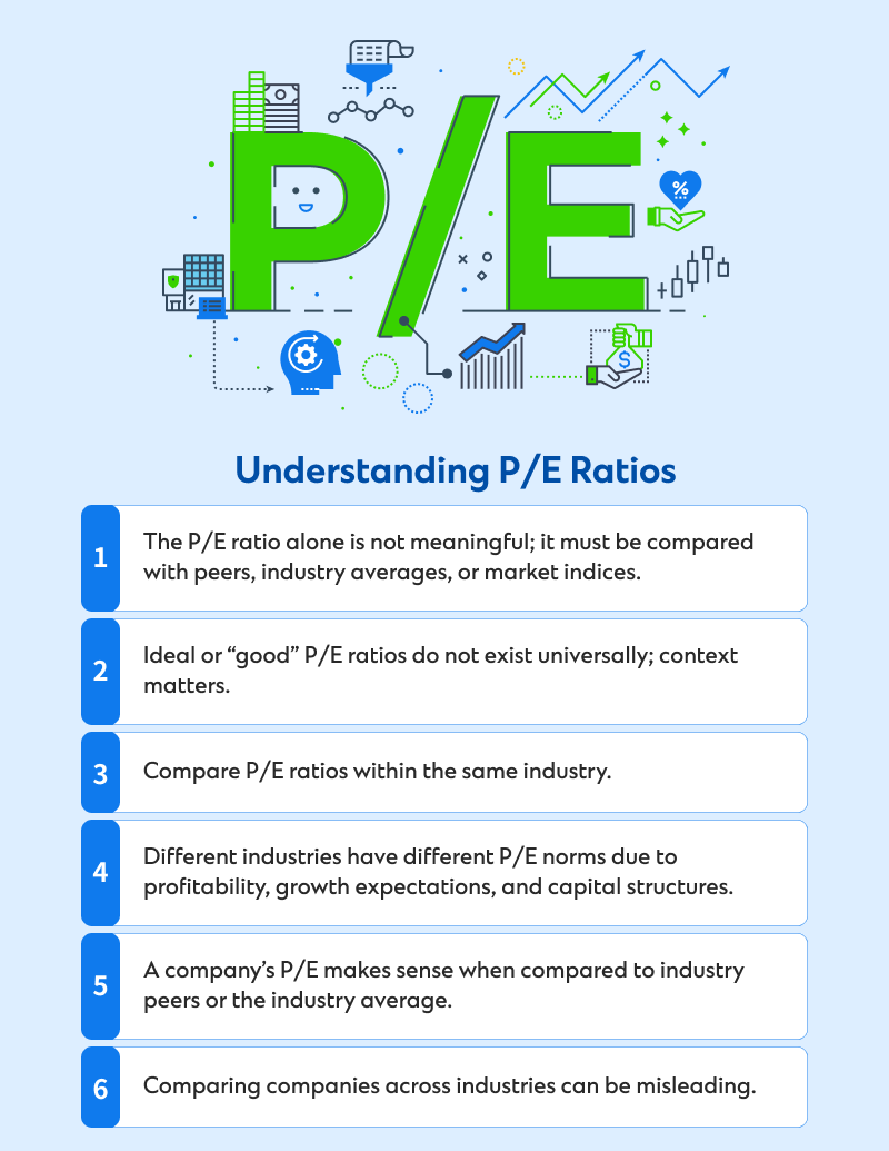 - While applicable for relative valuation and value investing, the P/E ratio doesn’t account for cash flow or debt and should be interpreted within the context of the industry and market.