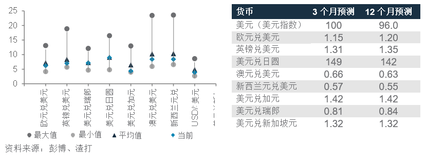 图. 18 外汇波动率低于5年平均水平;外汇预测表
