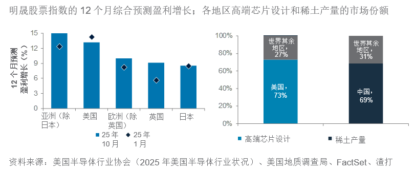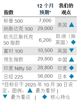 全球股市继续获益于业绩表现强劲及宏观经济环境改善。在2025年第三季强劲业绩的推动下,我们维持超配美国股票;基于12个月预测盈利增长的排名,美国市场仍明显领先其他发达市场。标普500指数也有望创下近四年来最强劲的销售额表现。美联储放宽政策巩固了我们认为美国经济能够实现软着陆的观点,应进一步支持盈利增长势头。由于双方互有制衡彼此的筹码,我们也相信中美将进入“基于权宜考虑而暂时休战”的贸易状态。风险包括投资者持仓过度看涨、市场对私人信贷市场的忧虑上升,以及盈利增长广度放缓。