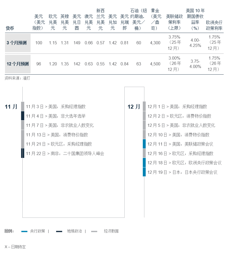除了短期反弹之外,我们预计美元将在未来6-12个月内下跌至96。美国劳动市场疲软、经济增长放缓以及政策不确定性上升,可能会促使美联储在2026年之前进一步减息。随着美国政策利率下调,而其他主要央行则维持利率不变(日本央行甚至加息),美元应会随之走弱。结构性拖累因素——如收益率差距收窄和持续的双重赤字,表明任何反弹都将是短暂的。美联储主席鲍威尔暗示在12月结束量化紧缩政策的信号,这可能会成为美元的另一个不利因素。