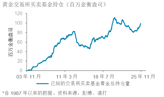 除结构性因素外,黄金亦受到三项周期性因素支持:a)美联储政策放宽及实际利率下跌,令黄金更为吸引:美联储在暂停九个月后于9月重启减息,以支持放缓的就业市场。尽管核心通胀仍接近3%,但美联储于10月再度减息至4.0%。我们预期美联储将于2026年底前再减息100个基点,拉低实际收益率。