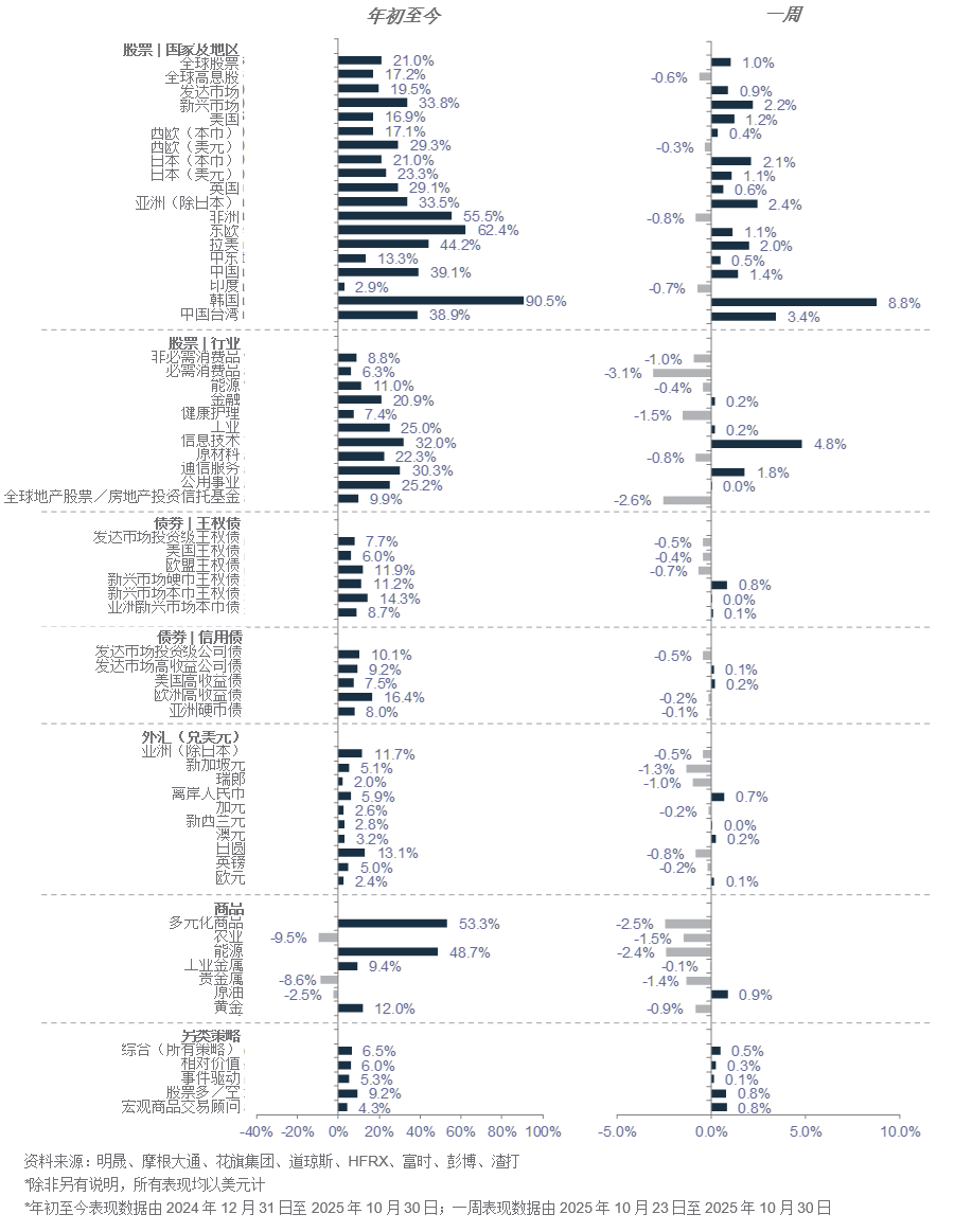 季节性走弱并未成为投资者的关注焦点。自9月底以来,在月中小幅波动的情况下,全球股票仍轻微录得正回报。虽然美国债券收益率下降,但全球债券仍大致上持平。即使计算最近几周的大幅回调,黄金整个月仍录得正回报。