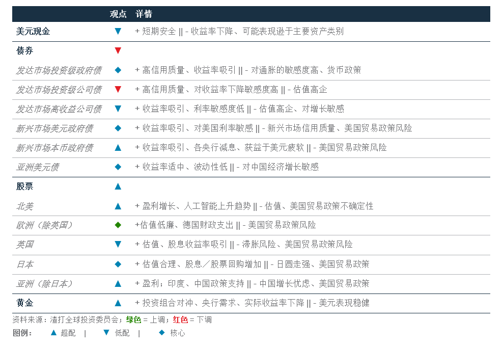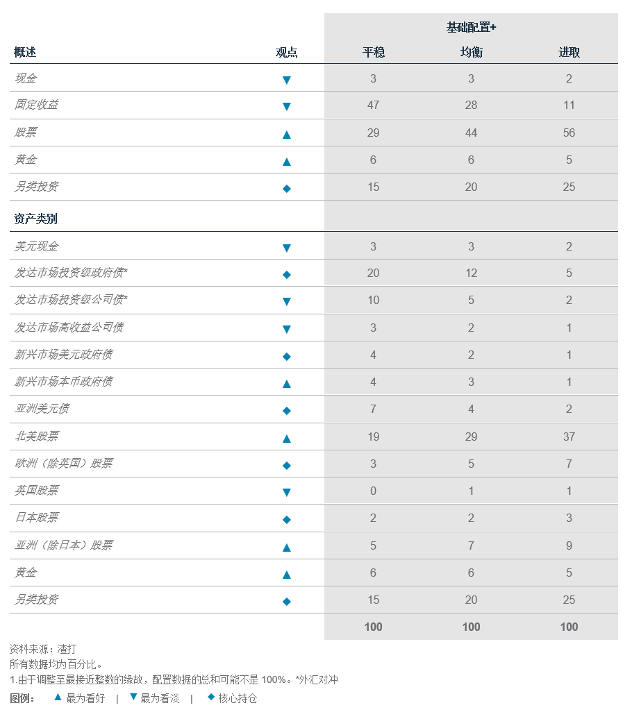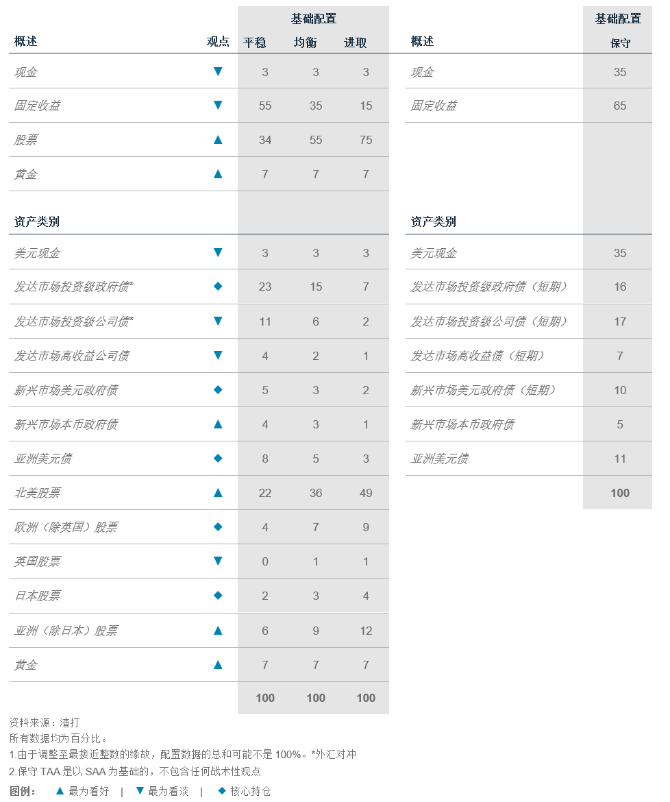 基础投资观点:我们已将全球债券的整体配置比例下调至低配。这主要是由于我们将公司债(“信用债”)下调至低配配置,而政府债(“利率债”)则维持核心配置。