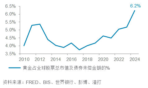黄金占全球股票市值及债券未偿金额的比重
