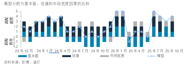 我们的股债模型超配股票,因为模型得分为+4(满分5分)。估值、基本面和技术面皆偏好股票多于债券。