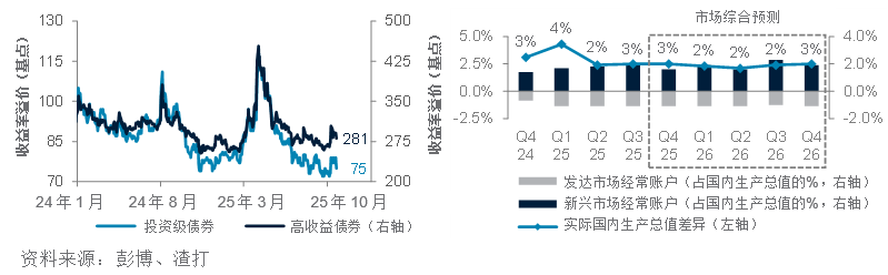 彭博美国投资级和高收益公司债的收益率溢价;新兴市场与发达市场的实际国内生产总值差异以及经常账户占国内生产总值的百分比
