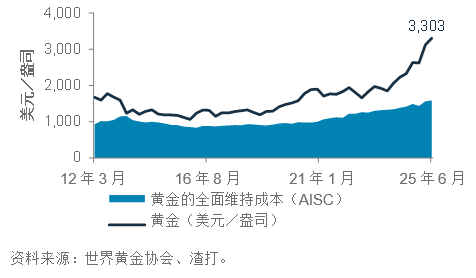 金价对比全面生产成本,截至2025年6月。