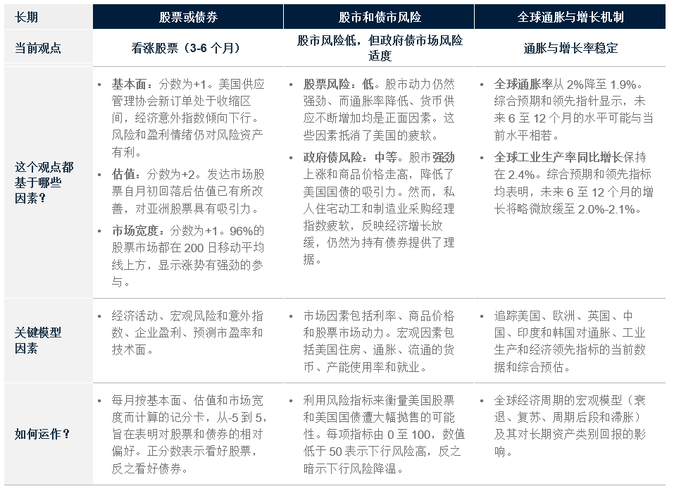 量化指标的整体分析也支持这一观点。尽管月中出现波动,但我们的短期量化模型仍看好全球股票。我们的长期股债模型也仍然明确看涨,因为基本面良好、市场广度健康及发达市场股票的估值在月初回调后已改善。