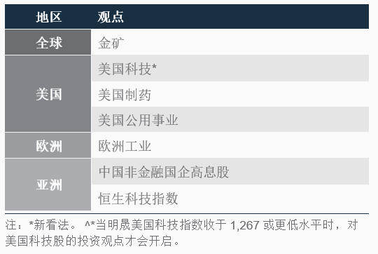 股票方面,基于当前市价,我们开启对金矿股的看涨观点,以捕捉金价回调带来的机会。在美国制药子行业和公用事业领域,我们也开启了机会型看涨观点,以增添一些防守性增长配置。
