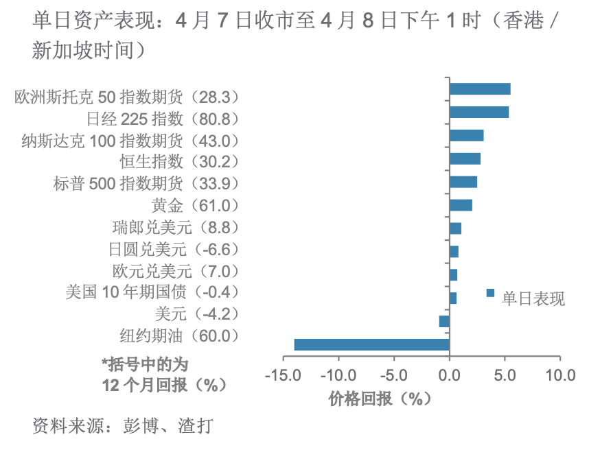油价急挫,风险资产反弹。我们预期相关走势将在未来一至两周延续。在撰稿时,布伦特油价较昨日收市下跌接近14%。亚洲股票大幅高开,而欧洲及美国股票期货显示将强势开市。美国10年期国债收益率跌穿4.25%,美元指数则跌穿99。