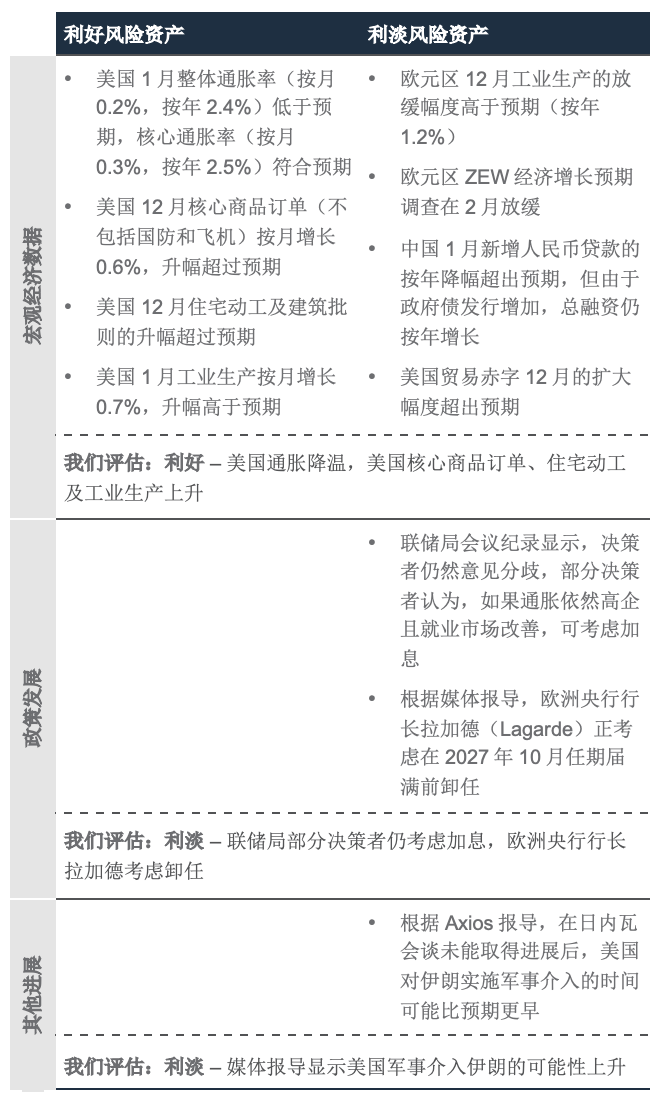 美国通胀继续降温:在经济增长扩张的同时,美国1月通胀继续放缓,整体通胀由12月的按年2.7%大幅下降至按年2.4%,核心通胀则放缓至按年2.5%,为2021年4月以来最低。除非中东冲突导致油价持续飙升,否则我们预计,随着关税影响消退及房屋通胀继续降温,通胀可望持续放缓。在11月中期选举前,负担能力仍是选民最关注的议题。如果最高法院推翻现有关税,总统特朗普可能会通过其他法规恢复部分关税,但我们预期,当局今年将推出更多措施以减低关税的影响,并降低商品价格。房屋及薪资通胀继续降温,或会带动服务业的通胀回落。