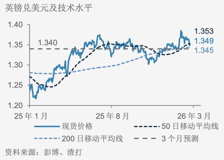 英镑仍受英国短期债券收益率可能走低与美元疲弱的双重影响。总的来说,我们预期未来三个月英镑兑美元或小幅走低至1.34。