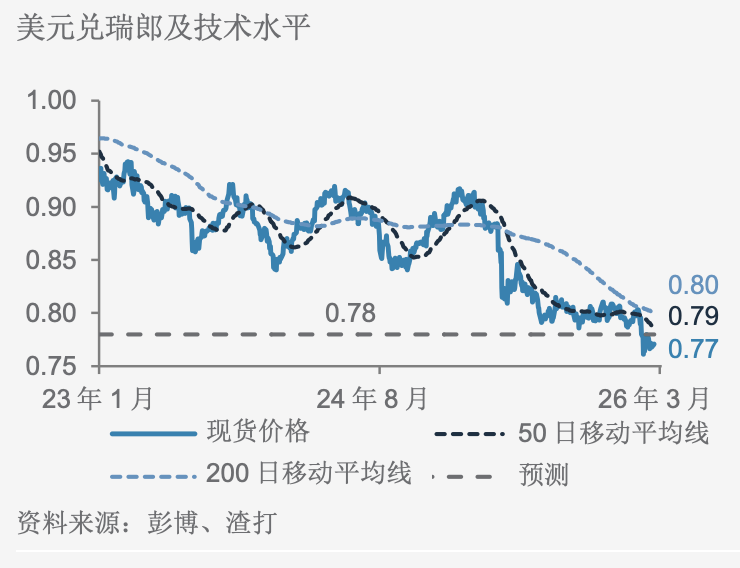 理据:瑞郎最近几周走强,跌穿关键的0.78水平,主要受美元走弱、瑞士实质利率依然高企及避险需求的影响。虽然避险需求可能会波动,但我们预期美元将进一步走弱,而瑞士实际利率仍将受到良好支持。我们预计2026年联储局会再减息三次,而瑞士政策利率则大致维持不变,意味着美元的利率优势将持续被削弱。美国与瑞士的利差正在收窄,可能成为推动美元走弱、瑞郎走强的主要因素。