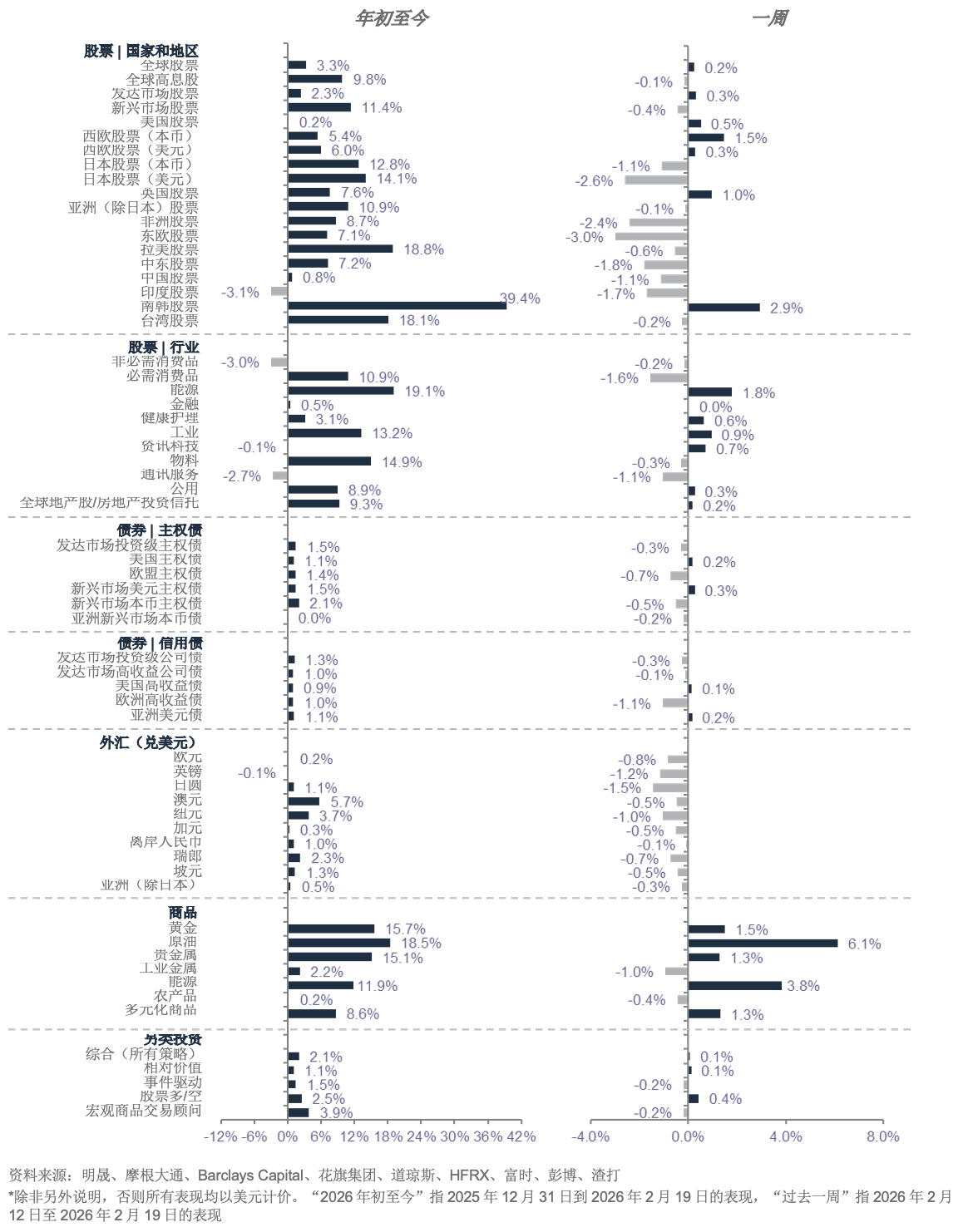 *除非另外说明,否则所有表现均以美元计价。“2026年初至今”指2025年12月31日到2026年1月29日的表现,“过去一周” 指2026年1月22日至2026年1月29日的表现