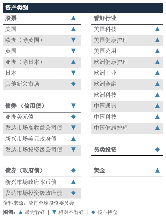 我们的观点:我们预期未来6-12个月欧洲和日本股票将落后于全球股票。然而,我们认为在欧洲超配的健康护理、工业、金融和科技行业蕴藏着投资机会。亚洲(除日本)市场仍然是我们偏好的美国以外市场。