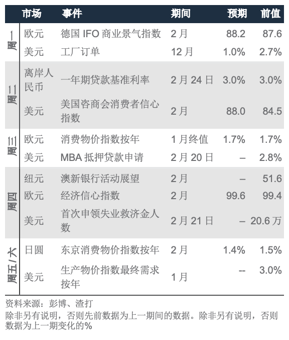 我们的观点:我们预期英伦银行将在3月减息。5-7年期英镑债券提供理想的平衡。英镑兑美元小幅走低至1.34