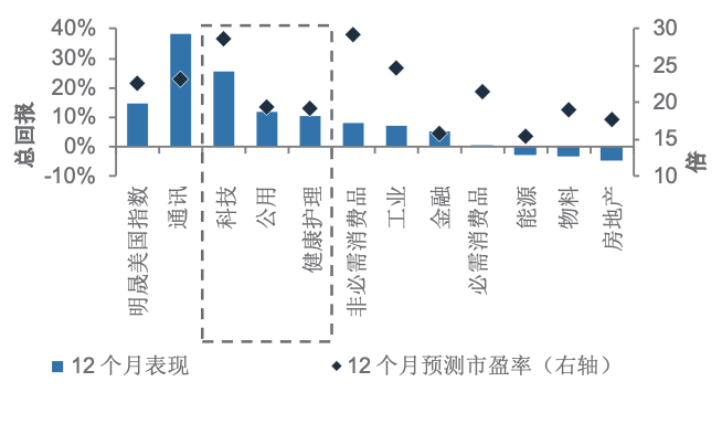 美国股票行业12个月回报和12个月预测市盈率