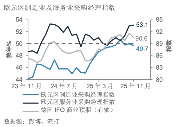 欧元区11月服务业领涨,而制造业采购经理指数则再度收缩