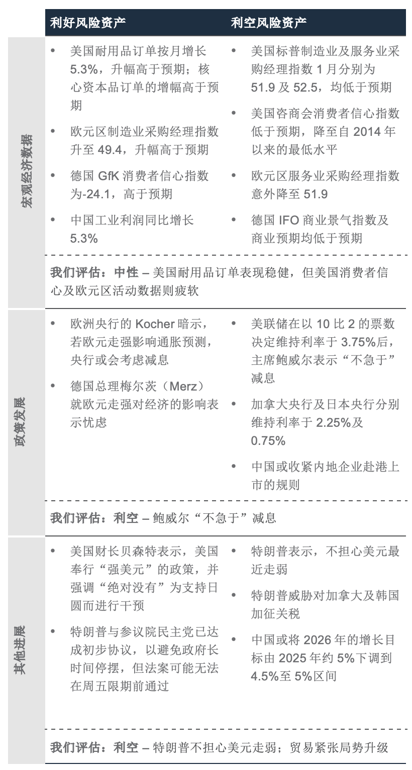美国科技股业绩和美元走弱将支持股市:美国科技行业2025年第四季的盈利表现强劲,持续支持股市。截至目前为止,该行业盈利增长28%,超过了标普500指数整体10%的增长,该行业2026年的盈利增长预测已上调至31%。从2026年正面的盈利指引来看,领跑者为半导体和互联网公司(见第4页)。美元走弱可能会进一步提振科技业今年的盈利增长,因为该行业有56%的收入来自海外。