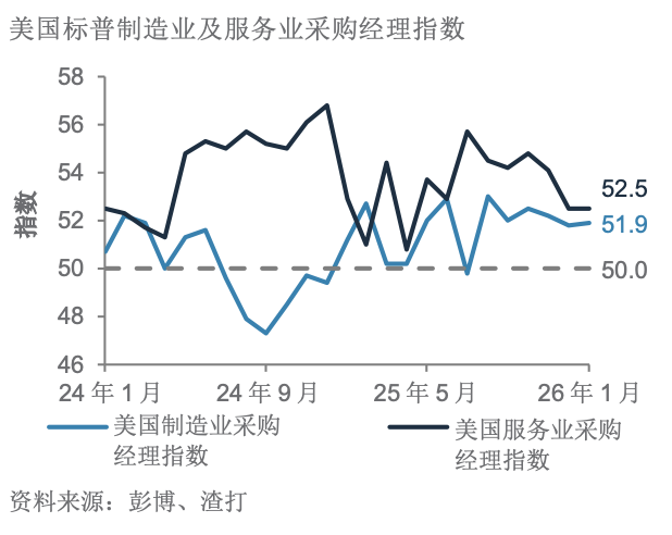 美国1月制造业及服务业采购经理指数均低于预期,但两者仍持续扩张