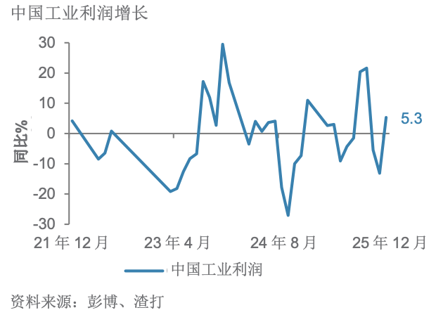 中国12月工业利润同比增长5.3%;2025年工业利润增长0.6%,为四年来首度录得全年增长