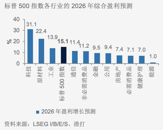 我们的观点:在半导体和互联网公司的带动下,美国科技行业录得最高的盈利增长,为美国各行业之首。2026年的预测仍然强劲。