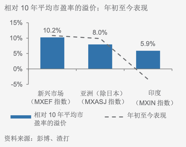 尽管亚洲(除日本)指数年初至今上升约10%,但印度指数却下跌4.6%。印度股市的相对估值(相对10年平均市盈率的溢价)目前有6%的溢价,较新兴市场和亚洲(除日本)市场更为吸引。