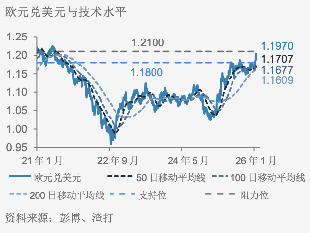 金价的中期驱动因素:金价的涨势受到新兴市场央行强劲需求的支持,这些央行正寻求降低对美元的依赖,推动外汇储备多元化。这一趋势可能会持续,尤其是新兴市场央行开始探索以黄金为支持的虚拟货币。去年,投资者需求为金价升势提供额外动力。根据世界黄金协会本周公布的报告,2025年全球黄金需求突破5,000公吨创下新高,主要受黄金ETF持仓录得史上第二高增幅,以及金条与金币购买量加速至12年高位所带动。同时,黄金供应量仅增长1%。特朗普对美元下跌不以为然的言论,导致美元跌至四年来的低位。在市场持续忧虑美联储独立性的情况下,若如市场预期般任命一位立场更为鸽派的新任美联储主席,美元或将进一步走弱,为金价提供支持。