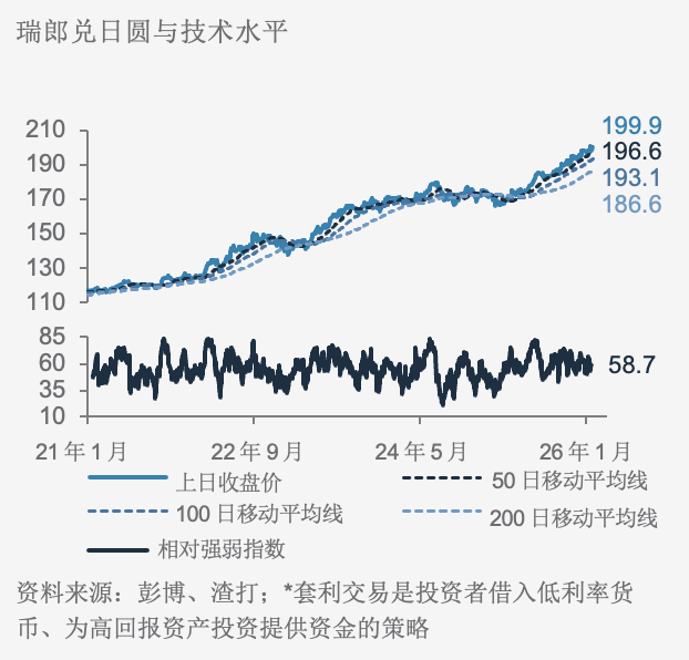 目前偏好瑞郎多于日圆作为避险货币:避险资金流入瑞郎,推动美元兑瑞郎跌至11年来的低位,加剧了所谓套利交易的风险。然而,图表显示目前进一步下跌的空间可能有限。瑞士央行重申,在必要时会干预汇市以缓和瑞郎的强势。我们认为,瑞郎兑日圆存在升值潜力,主要因为政治不确定性和财政政策担忧令日圆受压。如果日本首相高市早苗(Takaichi)在大选中赢得强大授权,美元兑日圆可能会再次测试160,重新引发日本央行干预的风险。