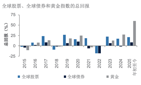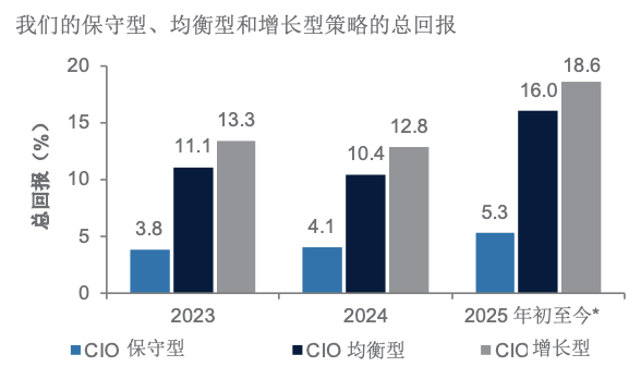 多元化策略有助应对风险上升:我们的多元化策略在充满地缘政治与经济冲击的一年中表现亮眼,有关冲击包括特朗普将关税提高至近一个世纪以来的最高水平,德国作出历史性的财政政策转向,而中国的物价指数依旧承压。在此背景下,我们专为愿意承担中度风险的投资者设计的均衡型策略,年初至今已录得16%的总回报,2024年和2023年的回报分别为10.4%和11.1%。我们今年大部分时间偏好黄金和股票的观点获得了丰厚的回报,这两类资产的表现都有望超越债券和现金。事实上,黄金或会连续第十年跑赢全球债券,也有望在过去六年中第四次跑赢全球股票。