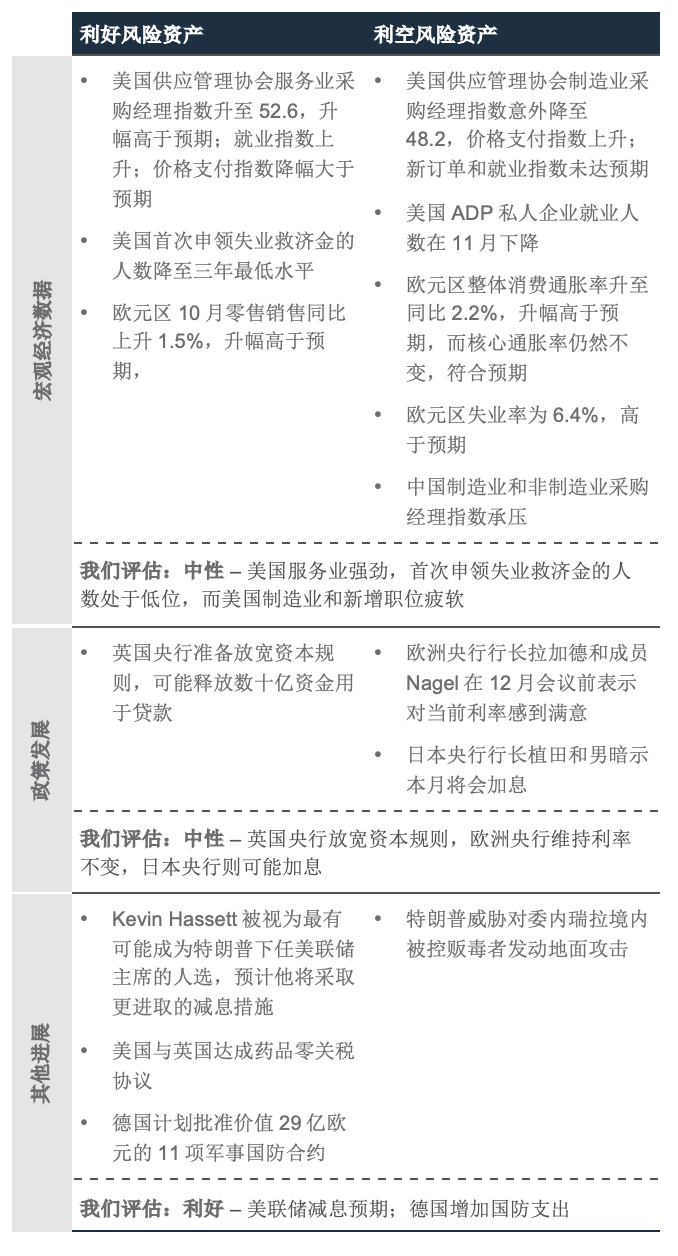 为波动做好准备:尽管市场表现强劲,但未来数周的五个事件可能会增加市场的波动:a) 美联储12月10日的政策会议;b) 美国将于美联储会议后公布大量数据,包括延迟公布的11月就业和通胀数据;c) 特朗普提名下一任美联储主席;d) 最高法院就特朗普关税的合法性和解雇美联储理事库克(Cook)作出的裁决;以及e) 日本央行12月19日的政策决议。