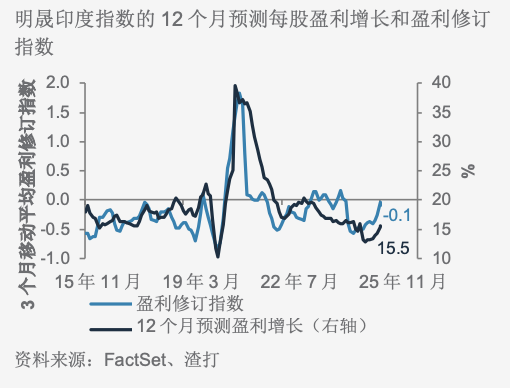 我们也预期投资者将重新关注印度股票。在利润增长放缓和关税压力下,印度市场的估值溢价年初至今已经回落,但不利因素正在减弱。2025年第三季国内生产总值增长为同比8.2%,远超预期。近期推出的宽松货币政策税收改革有助支持经济增长,并重振盈利增长。盈利修订指数已从负值区域回升,12个月预测每股盈利增长为15.5%,超越了亚洲的大部分地区。