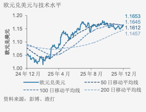 相反,欧洲央行可能在12月会议上维持利率不变。欧元区11月通胀升温至同比2.2%,而核心通胀维持在2.4%,支持政策稳定。德国的财政刺激措施以及欧元区的国防支出,均支持增长。技术上,欧元兑美元已升穿下降通道。欧元兑美元呈现温和看涨动力,我们现预计将测试1.1790的阻力位。
