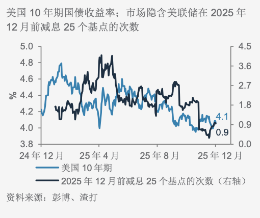市场几乎完全反映美联储在即将举行的会议上减息25个基点的预期。美国10年期国债收益率接近4%,处于我们短期目标区间的低位