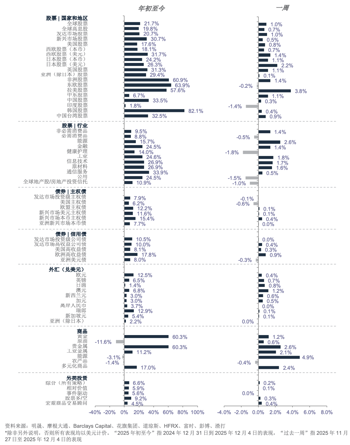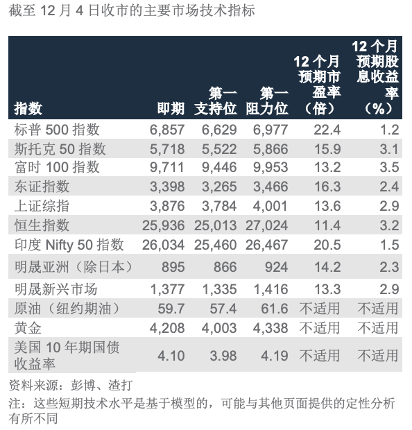 强烈看好黄金和股票:我们对黄金与股票在新一年的表现仍持乐观态度,预期新兴市场央行将持续购入黄金,美联储减息将推动美国经济软着陆,以及人工智能驱动企业的盈利增长。美国股市估值过高以及人工智能发展的前景面临挑战,可能导致市场波动,但我们建议在回调时增持。我们也仍然看涨亚洲(除日本)股票,尤其偏好中国与印度股市,两者分别提供了具吸引力的估值与增长机会(见第4页)。详情请留意我们将于1212日发布的《2026年全年展望》。