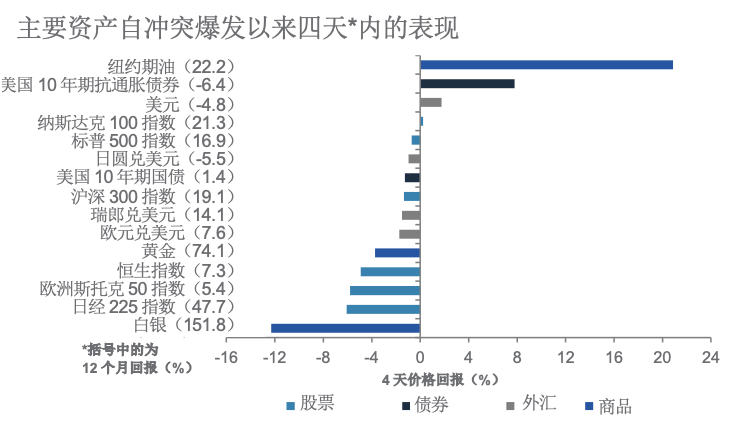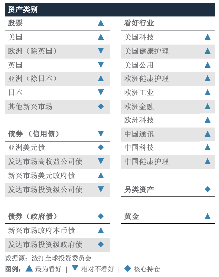 维持核心配置,建立对冲:鉴于我们对前景的看法,我们维持偏好风险资产的核心配置,同时建立对通胀升温的对冲。因美国是净石油出口国,美元资产将受惠于油价持续的升势。我们预测,如果不确定性持续,美国的航天与国防股、能源股及抗通胀债券将表现出色。我们倾向趁低吸纳黄金,因为黄金依然提供对地缘政治风险的结构性对冲。鉴于欧洲和亚洲为净能源进口地区,能源价格持续飙升对这两个地区的影响最大,但任何股市抛售都提供了价值型的投资机会。